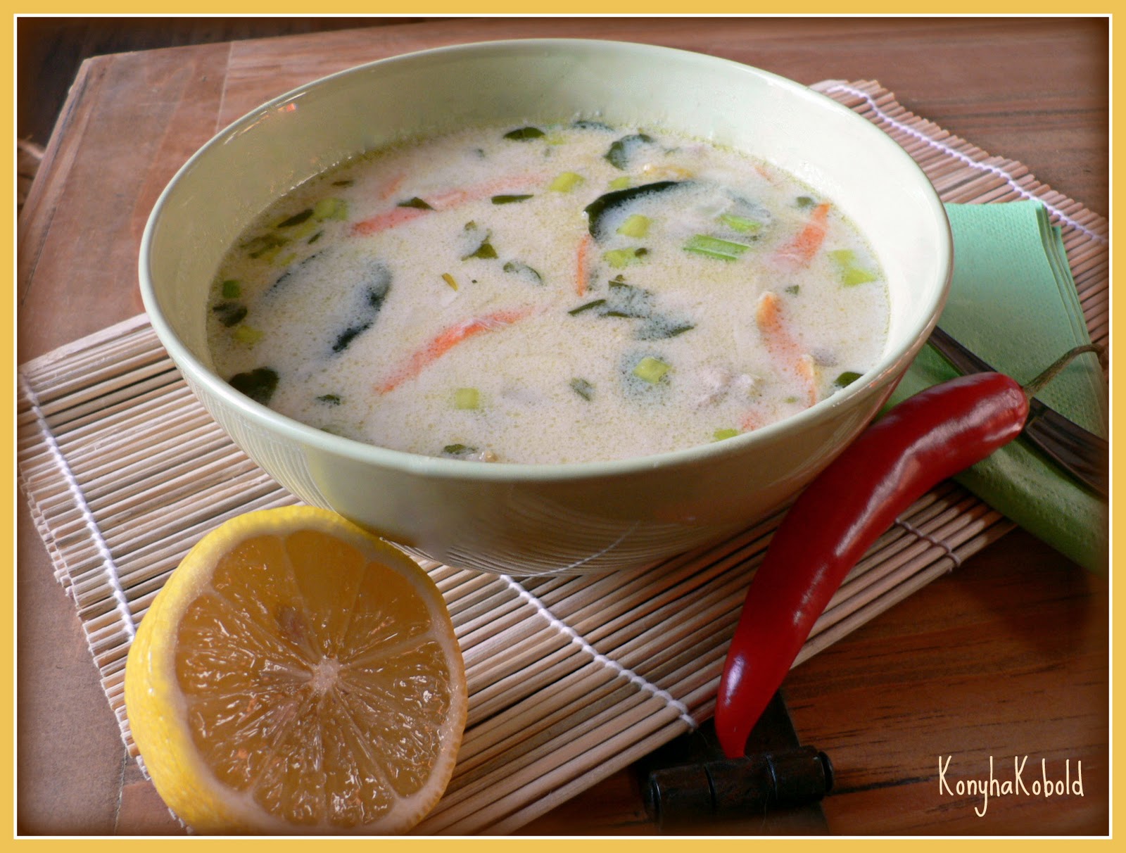 Az apróra vágott hagymát megfuttatom a szőlőmagolajon, majd hozzáteszem a fokhagymát, galangált, citromfüvet, lime levelet, chilit és kicsit párolom őket. Felöntöm a húsleves alaplével, beleteszem a csirkemellet és a mandulát. Mikor megpuhult a husi, takarékra veszem a lángot, és 10-15 perc múlva a már csak gyöngyöző vízbe öntöm a kókusztejet. Ez azért fontos, mert ha a forrásban lévő vízbe önteném, kicsapná és nem lenne homogén a leves.